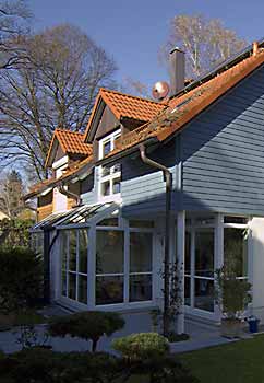 | Eine familiär wirkende Anlage wurde zwischen altem Baumbestand verwirklicht. Die Kleinmaßstäblichkeit findet sich in der Holzverschalung und den eingearbeiteten Gauben und Wintergärten wieder. |