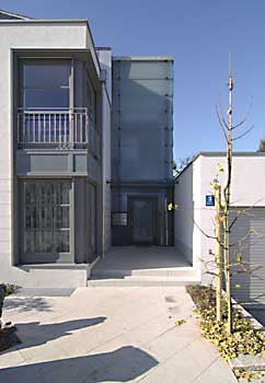 | Ein schlichter, moderner Baukörper mit asiatischen Akzenten wurde entsprechend den Bauherrenwünschen umgesetzt. Ein mit Glasschuppen geschütztes Treppenhaus ist als eigenständiger prägnanter Kubus angegliedert. |